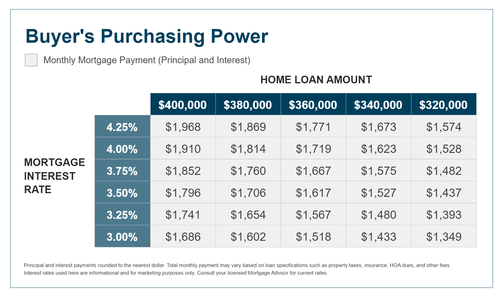 This chart shows how 1.25 % increase in rate could affect monthly principal and interest payment. For Example; the P&I payment on $400,000 at a rate of 3% is $1,686 per month but that same price calculated with a 4.25 % rate is $1,968 per month. A difference of $282 per month.