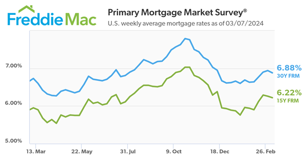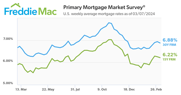 Freddie Mac reports the 30-year FRM averaged 6.88 percent as of March 7, 2024, down from last week when it averaged 6.94 percent. A year ago, at this time, the 30-year FRM averaged 6.73 percent.