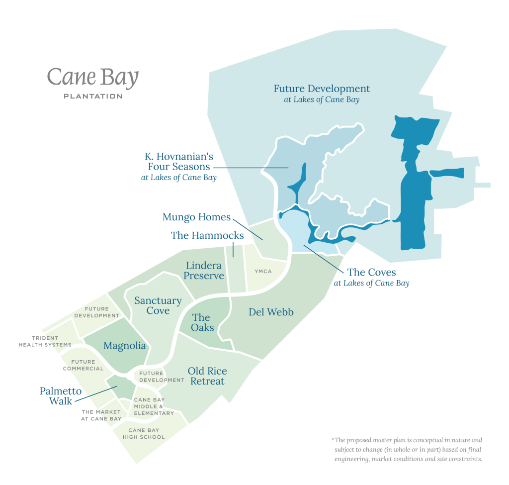 Cane Bay comprises over 4500 acres of land located in Berkeley County. There are a variety of neighborhoods within the vast community, each with their unique characteristics and amenities connected by a 25-mile trail system. There are two subsections dedicated to 55+ lifestyles: The Four Seasons and Del Webb.