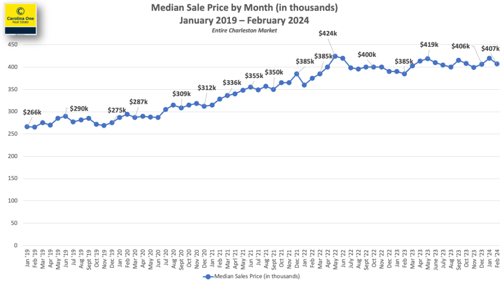 SALES PRICE – The Median sales price closed out at $415,685, up 3% over October of 2023 and The Year-to-date median sales price was up 4.25% over 2023. The average sales price for October 2024 was $644,758. The Median sale price in the Charleston market continues to stay in a tight band between $400k and $425k where it has been for most of the last 27+ months.