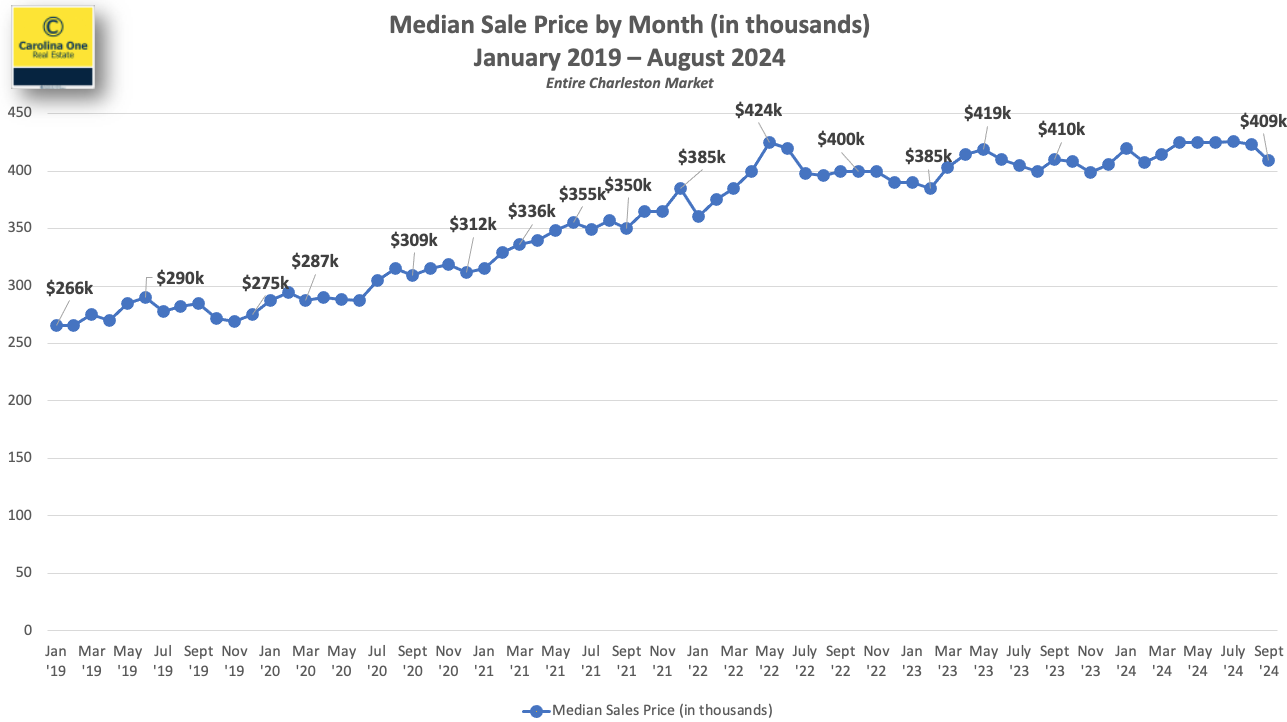 SALES PRICE – The Median sale price closed out at $409,085 in September 2024. The Charleston market continues to stay in a tight band between $400k and $425k where it has been for most of the last 27+ months. The average sales price was $627,254 in September 2024.